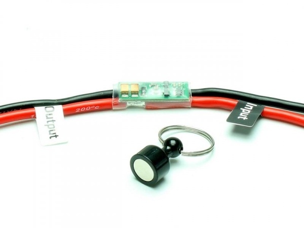 Leistungsfähiger, zuverlässiger Universal Schalter. Dadurch ist es möglich, die Stromquelle ein-/bzw. auszuschalten ohne einen mechanischen Schalter zu betätigen, bzw. das Modell öffnen zu müssen.Der Schalter wird z.B. im Rumpfinneren verbaut. Zum ein/ausschalten wird einfach der beiliegende Magnet über die Montagestelle des Schalters, außen am Modell kurz entlang gezogen.