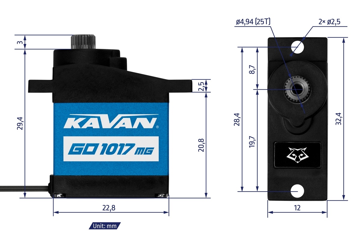 Starkes und schnelles programmierbares Digital Mikroservo 17g mit Titan-Getriebe und breitem Spektrum der Versorgungsspannung (4,8-8,4V), 2xBB, ideal für schnelle RC-Segler und kleinere Motormodelle. Stellkraft 3,0kg.cm, Geschwindigkeit 0,15s/60° bei 4,8V, Stellkraft 3,8kg.cm, Geschwindigkeit 0,13s/60° bei 6,0V, Stellkraft 4,2kg.cm, Geschwindigkeit 0,11s/60° bei 7,4V, Stellkraft 4,5kg.cm, Geschwindigkeit 0,10s/60° bei 8,4V. Abmessungen 22,8x12x29,4mm, Gewicht 17g, Gehäuse mit Aluminium-Mittelteil für perfekte Kühlung bei hoher Belastung. Das starke und schnelle programmierbare Digital Mikroservo mit Titan-Getriebe und zweifach kugelgelagerter Abtriebswelle für den Einsatz in RC-Modellen aller Typen. Dank der flachen Box mit einer Höhe von 12 mm eignet es sich besonders für die Steuerung von Querrudern und Klappen bei schnellen RC-Seglern/Hotlinern mit dünneren Flügelprofilen. Für eine perfekte Kühlung auch bei hoher Belastung ist das Servo in einem Kunststoffgehäuse mit einem Aluminiummittelteil untergebracht.